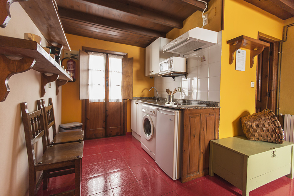 Cocina equipada con lavadora, frigorífico, microondas y menaje de cocina.